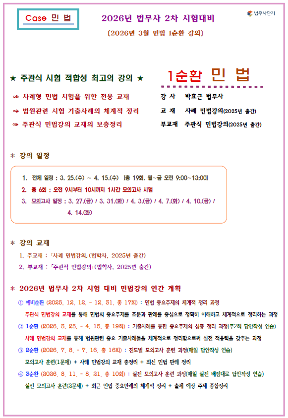 - [법무사단기] 260325(수) 2026년 법무사 2차 1순환 민법 박효근_강의계획서.pdf 0.178MB
